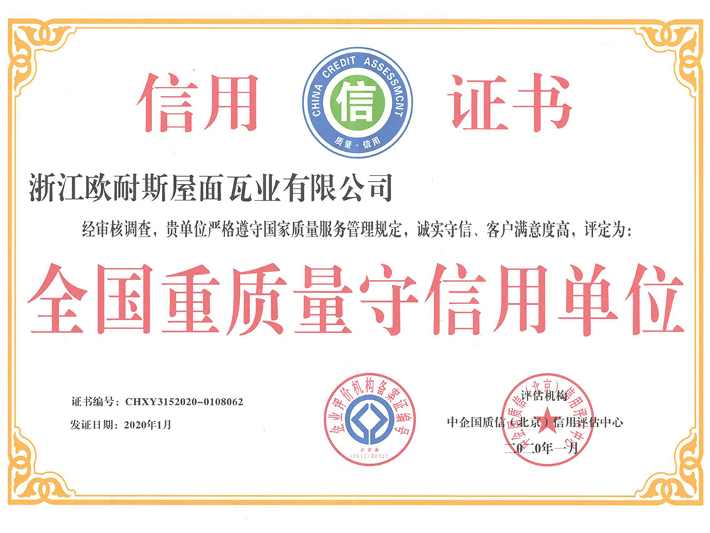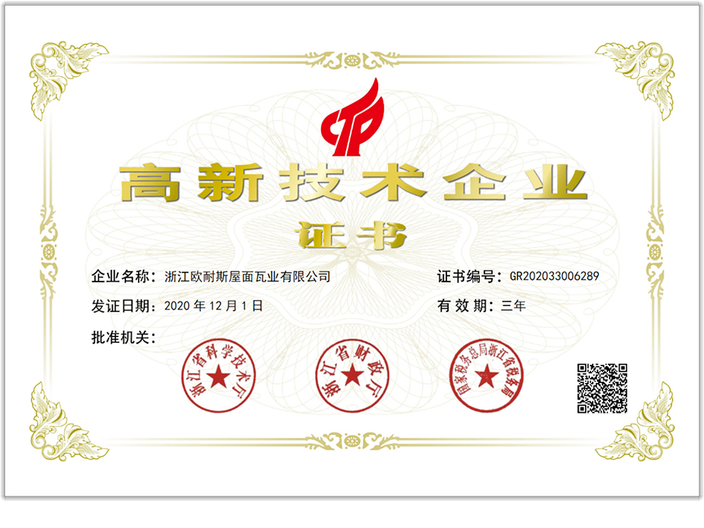 浙江歐耐斯屋面瓦業有限公司成立于1999年是一家集研發、生產、銷售和服務為一體的高新技術企業。公司憑借全國標品質的產品,銷售跟蹤式服務,在瀝青瓦行業內崛起。全公司現有員工60多人,銷售服務網絡覆蓋國內外150多個城市,年產量500萬平方。歐耐斯瓦業自成立以來,依托完善的法人治理結構,堅持技術創新、市場創新和管理創新之路,實現公司品牌化發展之路。