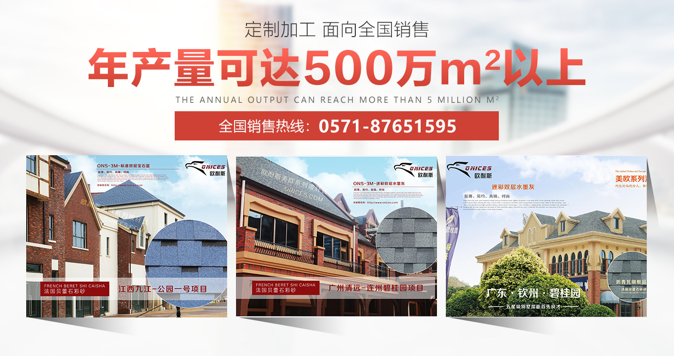 浙江歐耐斯屋面瓦業有限公司成立于1999年是一家集研發、生產、銷售和服務為一體的高新技術企業。公司憑借全國標品質的產品,銷售跟蹤式服務,在瀝青瓦行業內崛起。全公司現有員工60多人,銷售服務網絡覆蓋國內外150多個城市,年產量500萬平方。歐耐斯瓦業自成立以來,依托完善的法人治理結構,堅持技術創新、市場創新和管理創新之路,實現公司品牌化發展之路。